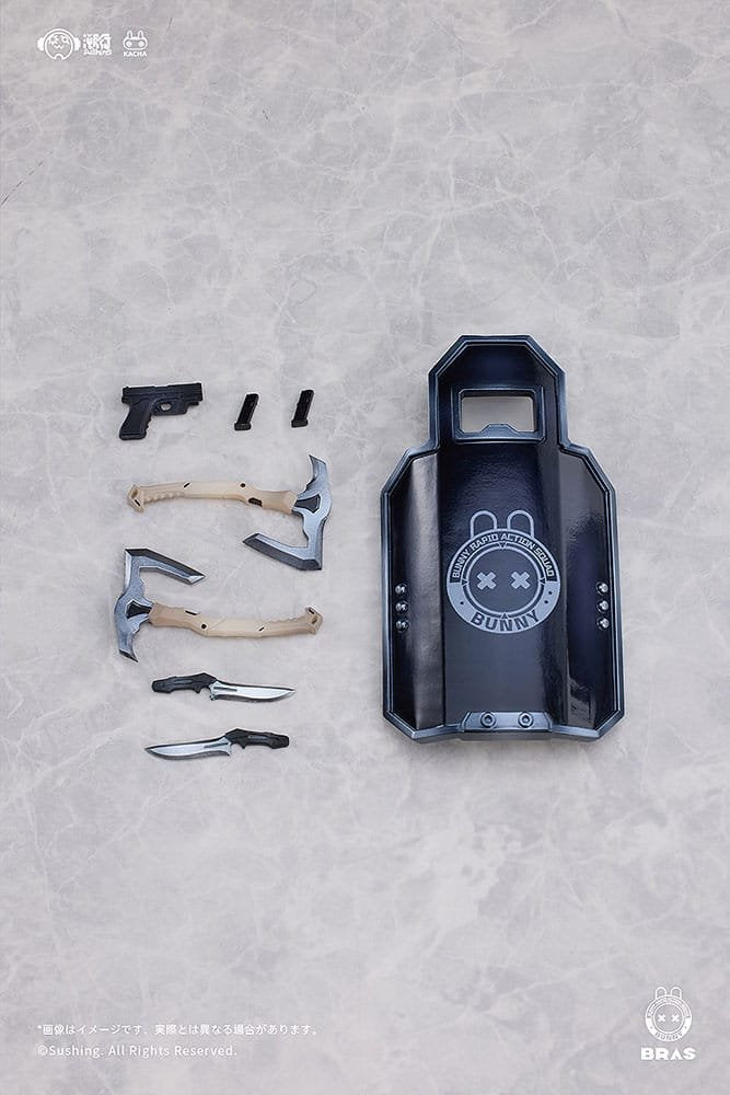 Descrizione Tecnica: Introducing the second installment of the "BUNNY RAPID ACTION SQUAD" series: Guardian Erena, the adorable and dependable protector and older sister of the team! Includes 4 interchangeable face parts, 5 sets of interchangeable hand parts, weapons storage base, and KACHA joints for maximum movement. Don't miss out on adding Erena to your collection!