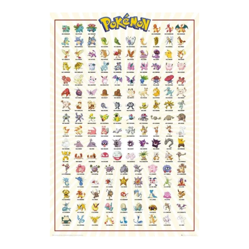 Poster dedicato al mondo Pokémon con la completa Pokédex della prima generazione, che raccoglie tutti i Pokémon classici della regione di Kanto.
