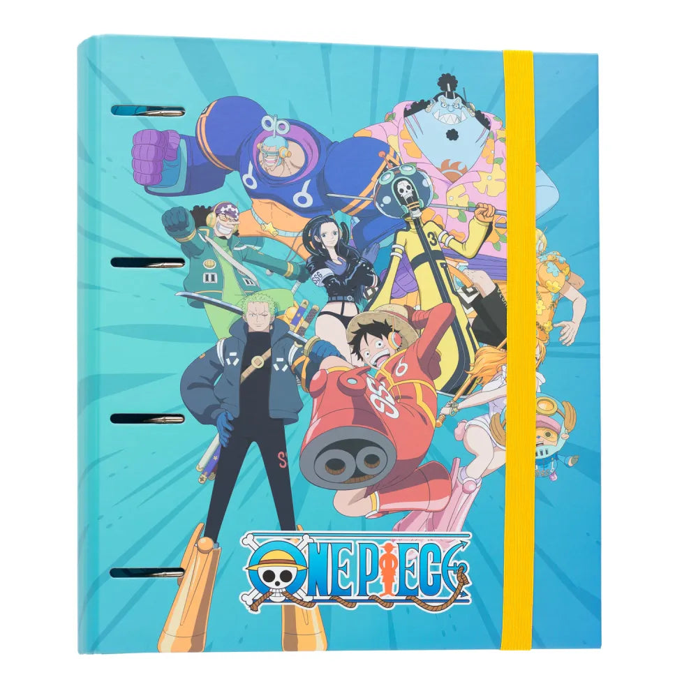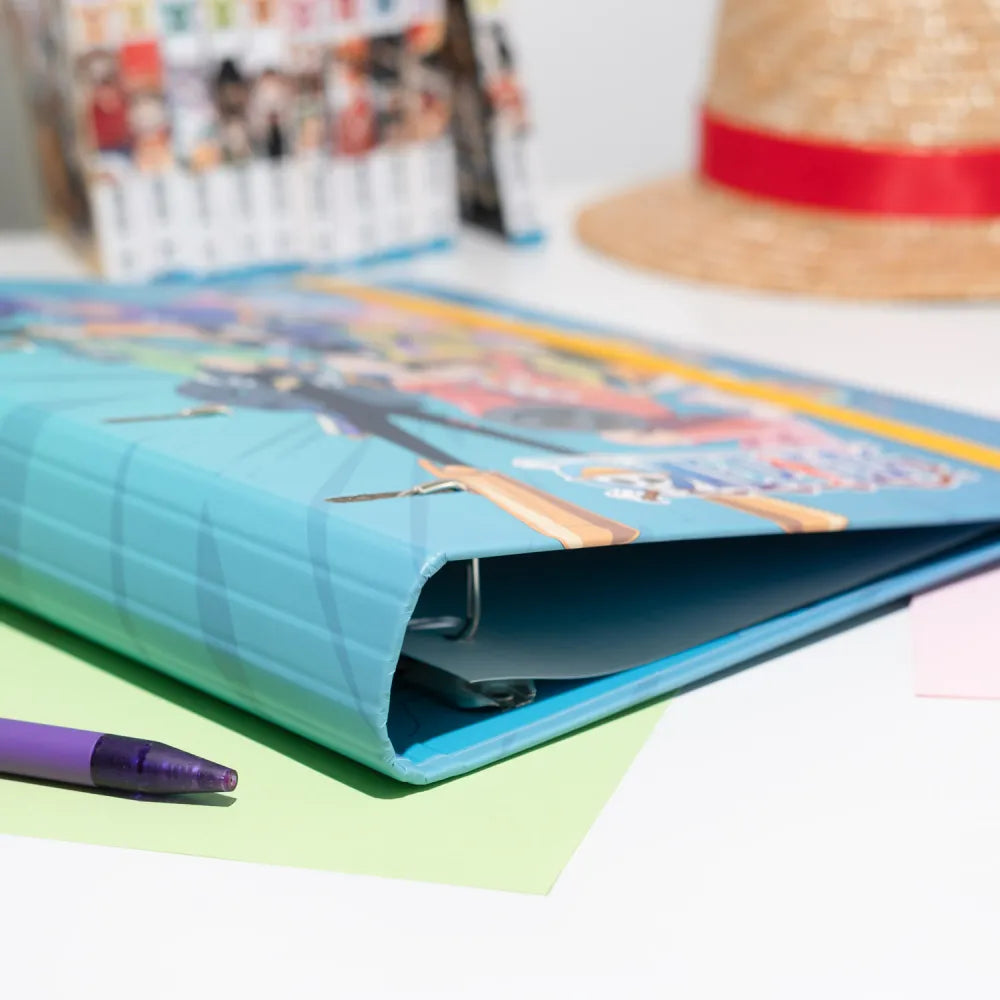 Raccoglitore di One Piece con copertina rigida in cartone dello spessore di 2 mm e rivestiti con carta da 150 gr/m2 laminata opaca. Hanno una dimensione di 32 x 27,5 cm, rilegatura a 4 anelli, chiusura con elastico da 9 mm e design interno personalizzato.