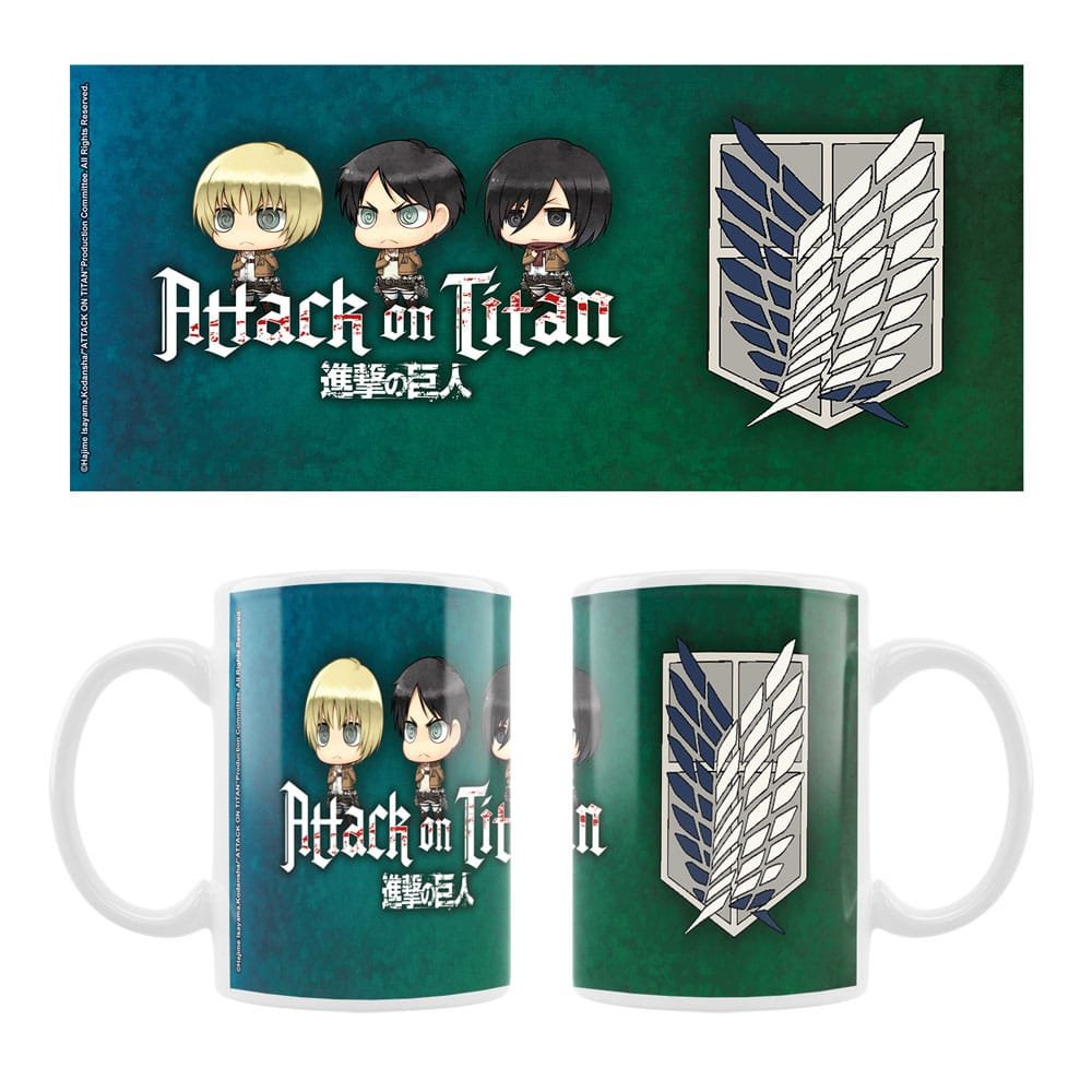 Porta a casa un pezzo unico della tua serie preferita con questa tazza in ceramica Attack on Titan, raffigurante Eren, Mikasa & Armin in stile chibi!