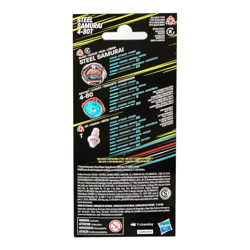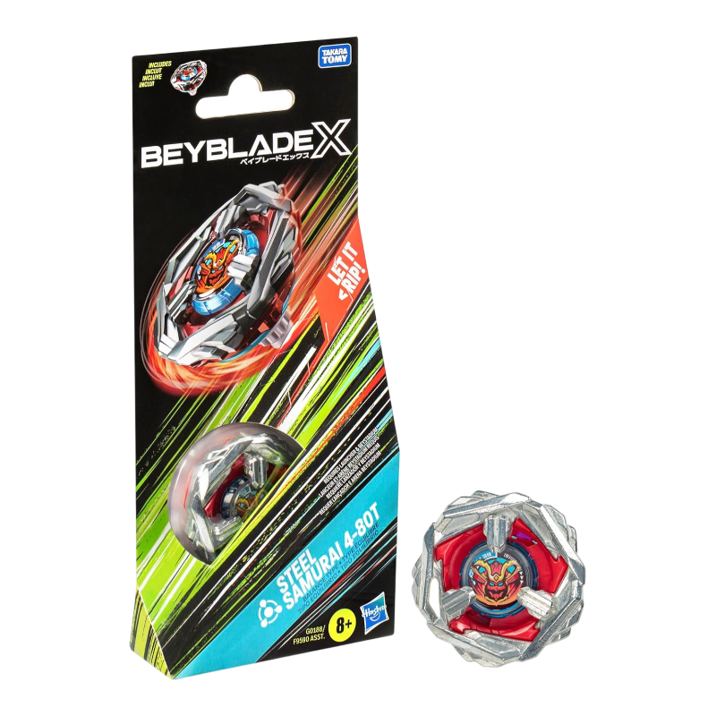 Il Samurai 4-80T è un Beyblade ufficiale della serie Beyblade X, progettato per offrire battaglie dinamiche e ad alta velocità grazie al sistema innovativo Beyblade X.