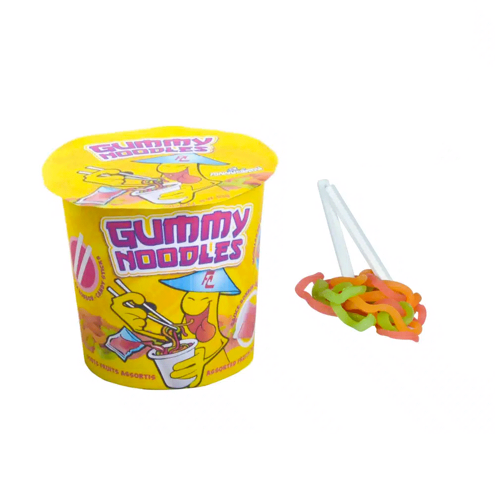 FC Gummy Noodles è un set di vermicelli gommosi alla frutta da 63g, completo di sciroppo dolce e bacchette commestibili per gustarli come un vero piatto di noodles… ma tutto di caramella!