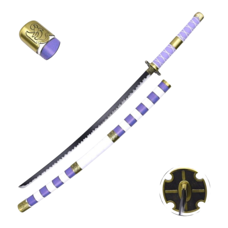 Porta con te questa katana dalle dimensioni imponenti: lunga 96 cm con una lama di 68 cm e un peso di 980 grammi. Un'aggiunta essenziale alla collezione di ogni fan di One Piece.