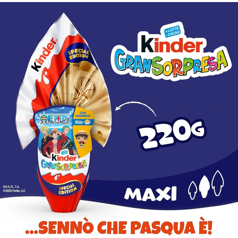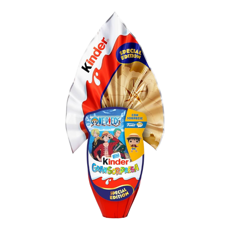 L’edizione speciale dell’Uovo di Pasqua One Piece firmata Kinder porta nelle tue mani il perfetto mix di gusto, magia e collezionismo! Questa versione da circa 220 g è realizzata con il classico cioccolato al latte finissimo di Kinder e include sorprese esclusive a tema One Piece ispirate ai personaggi più amati dell’anime e manga.