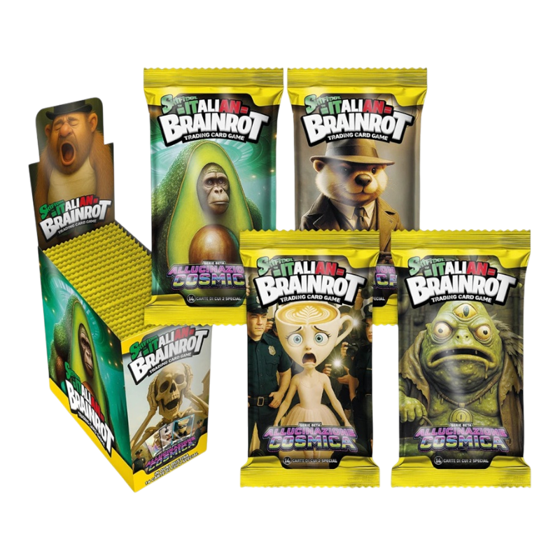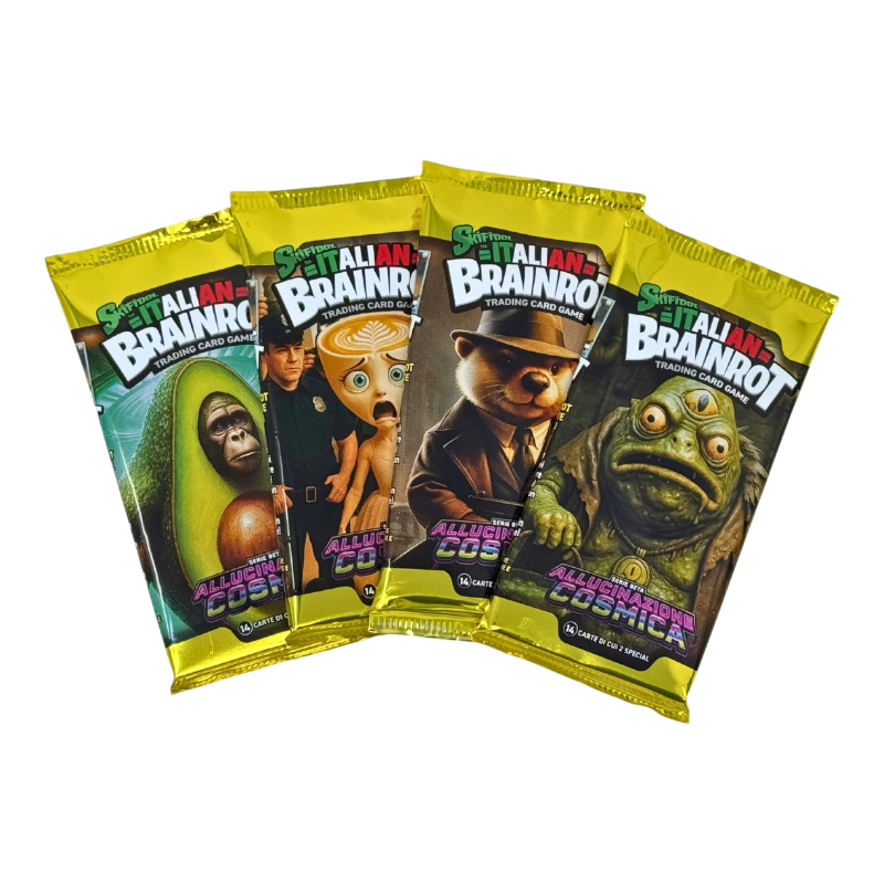 Scopri il nuovo fenomeno collezionistico con Skifidol Italian Brainrot TCG - Allucinazione Cosmica! Ogni bustina contiene 14 carte casuali ricche di ironia, colori psichedelici e riferimenti all’universo più delirante e divertente del momento.